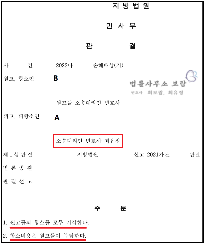 결국 법원은 최보람, 최유정 변호사의 주장을 받아들여 친척 B의 청구를 전부 기각했습니다.