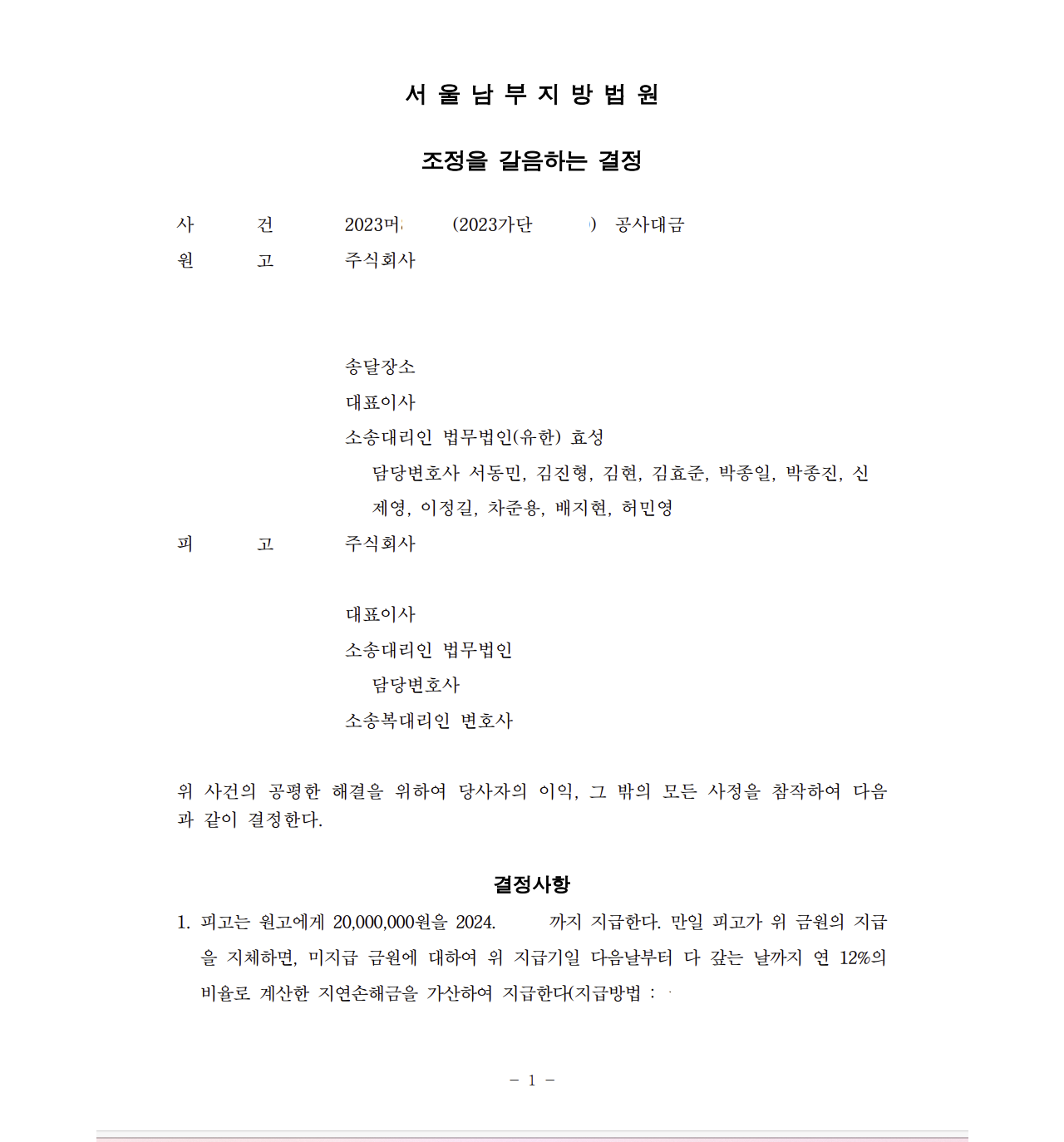 저는 즉각 공사대금청구소송을 제기하면서 피고의 미수금 미지급, 하자의 부존재 등을 주장 입증하였고 법원은 소액 감액된 공사대금을 즉시 지급하는 내용의 강제조정을 하여 의뢰인은 빠르게 미수금을 받아내었습니다.