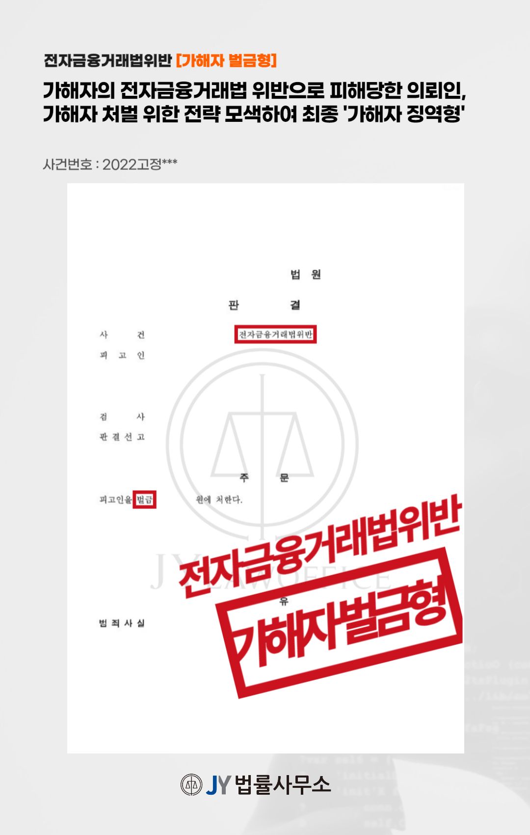본 사건의 의뢰인은 가해자의 전자금융거래법 위반으로 피해를 당하게 되었고, 이에 대응하기 위해 본 JY법률사무소를 찾아주셨습니다.