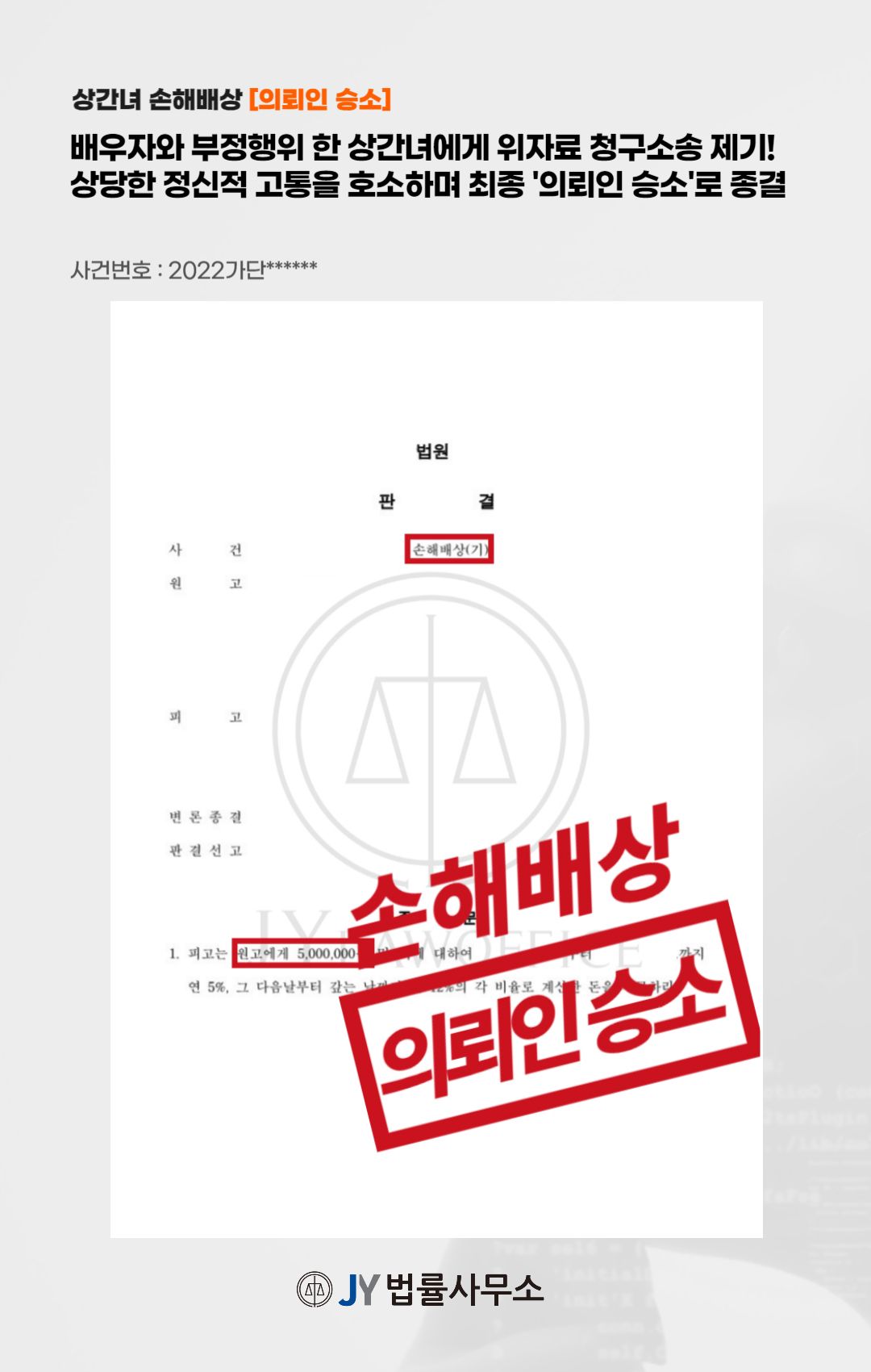 본 사건의 의뢰인은 배우자와 부정행위를 한 상대에게 상간녀 위자료 청구소송을 제기하기 위해 본 JY법률사무소를 찾아주셨습니다.