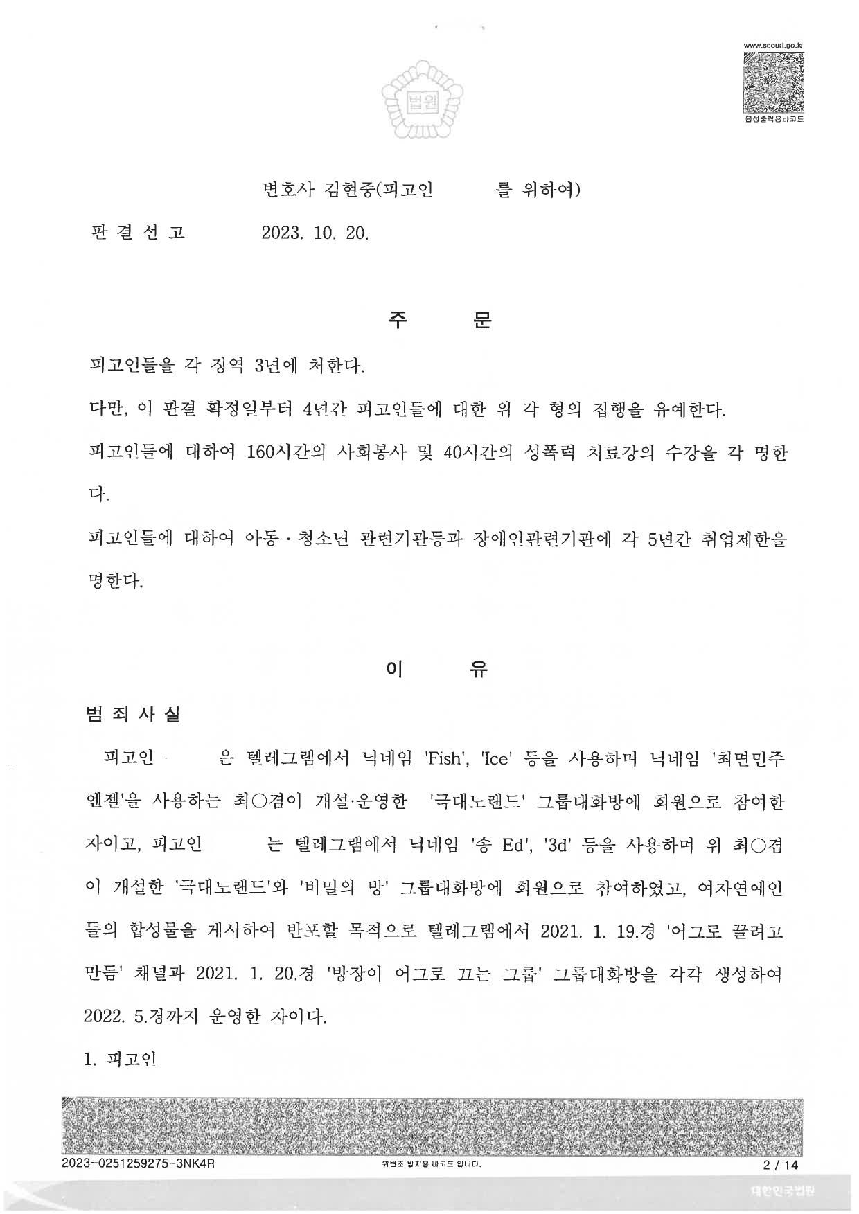 아청물 제작 및 유포, 불법촬영물 유포, 허위영상물 제작 및 유포, 음란말 유포 혐의로 입건 되었습니다.