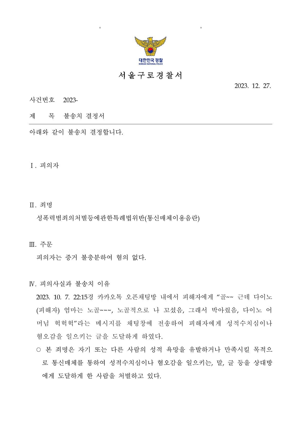 피의자를 송치하려거든 피의자가 위 채팅을 보낸 일련의 사실관계가 왜 2018도9775판례의 전제사실관계와 유사한 것인 지 수사기관이 명확하게 설명을 하여 송치하려 달라고 요청 하면서,