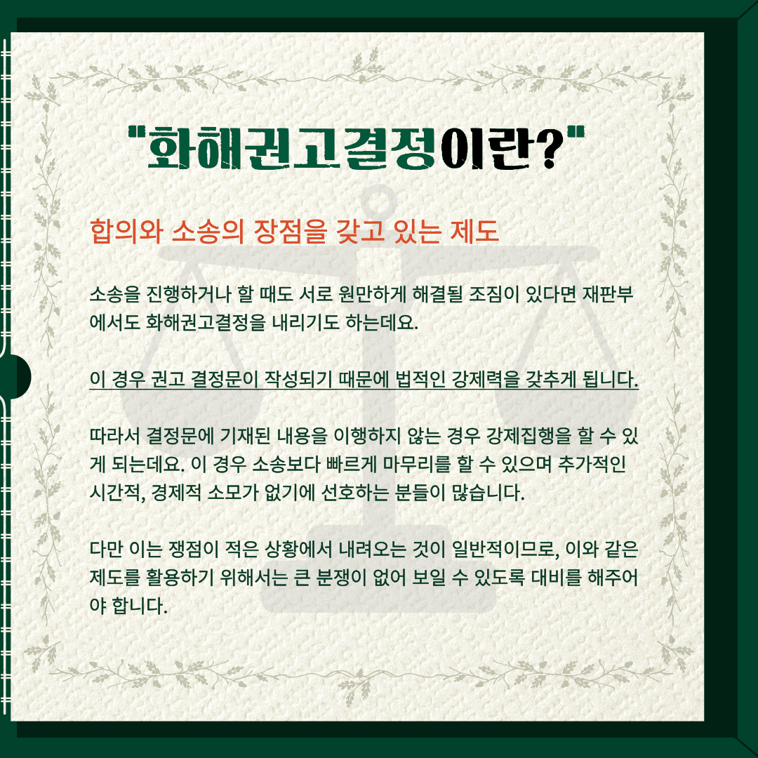 쉽게 설명을 하자자면 합의와 소송의 장점을 갖고 있는 제도입니다. 소송을 진행하거나 할 때도 서로 원만하게 해결될 조짐이 있다면 재판부에서도 화해권고결정을 내리기도 하는데요. 이 경우 권고 결정문이 작성되기 때문에 법적인 강제력을 갖추게 됩니다. 따라서 결정문에 기재된 내용을 이행하지 않는 경우 강제집행을 할 수 있게 되는데요. 이 경우 소송보다 빠르게 마무리를 할 수 있으며 추가적인 시간적, 경제적 소모가 없기에 선호하는 분들이 많습니다. 다만 이는 쟁점이 적은 상황에서 내려오는 것이 일반적이므로, 이와 같은 제도를 활용하기 위해서는 큰 분쟁이 없어 보일 수 있도록 대비를 해주어야 합니다.