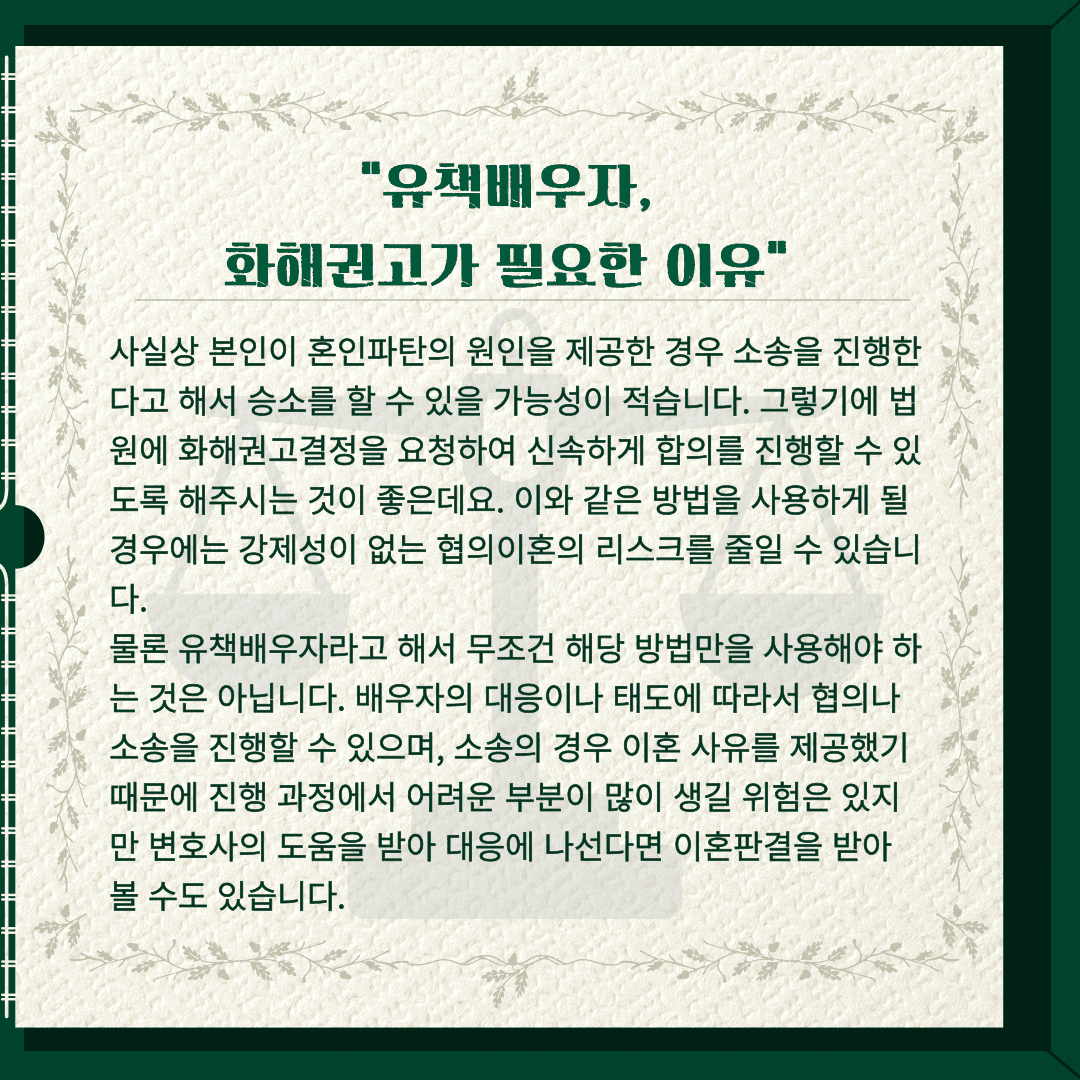 사실상 본인이 혼인파탄의 원인을 제공한 경우 소송을 진행한다고 해서 승소를 할 수 있을 가능성이 적습니다. 그렇기에 법원에 화해권고결정을 요청하여 신속하게 합의를 진행할 수 있도록 해주시는 것이 좋은데요. 이와 같은 방법을 사용하게 될 경우에는 강제성이 없는 협의이혼의 리스크를 줄일 수 있습니다.