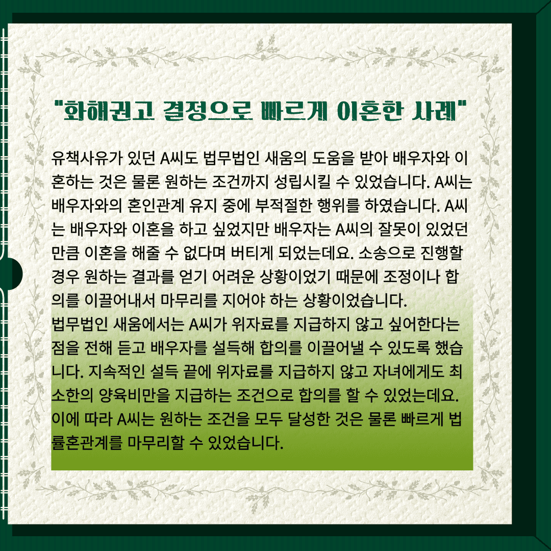 법무법인 새움에서는 A씨가 위자료를 지급하지 않고 싶어한다는 점을 전해 듣고 배우자를 설득해 합의를 이끌어낼 수 있도록 했습니다. 지속적인 설득 끝에 위자료를 지급하지 않고 자녀에게도 최소한의 양육비만을 지급하는 조건으로 합의를 할 수 있었는데요. 이에 따라 A씨는 원하는 조건을 모두 달성한 것은 물론 빠르게 법률혼관계를 마무리할 수 있었습니다.