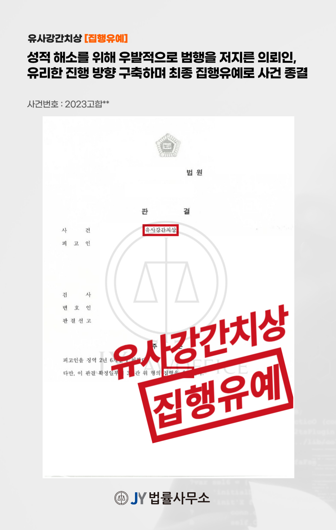 이와 같은 변호인의 조력으로 의뢰인은 집행유예 판결을 받고 사건을 무사히 종결시킬 수 있었습니다.