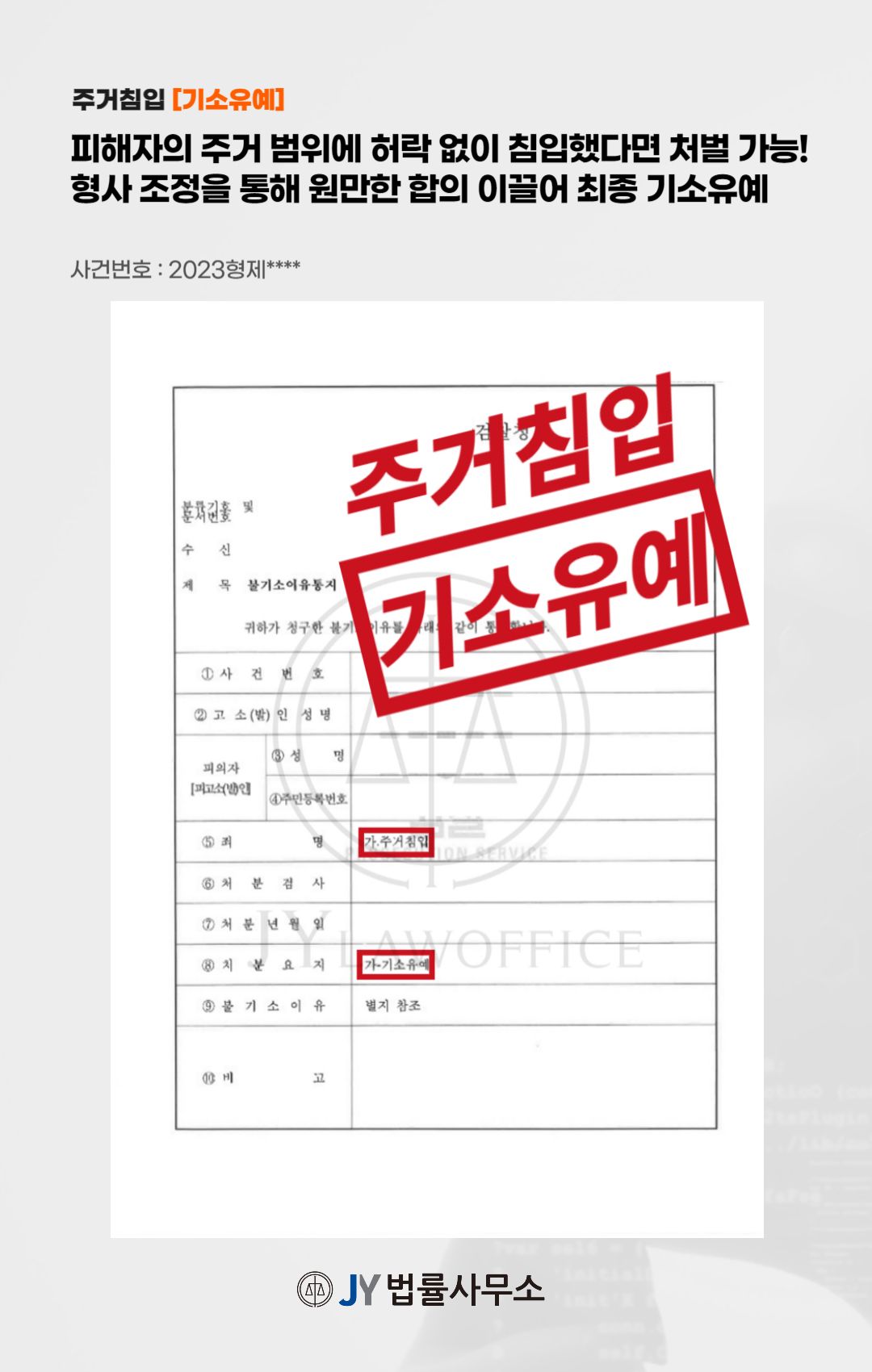 본 사건의 의뢰인은 우발적으로 피해자의 주거지에 침입하여 '주거침입'혐의를 받게 되었습니다. 이에 본 의뢰인은 사건과 관련해 법리적인 대응 방안을 모색하기 위해 본 JY법률사무소를 찾아주셨습니다.