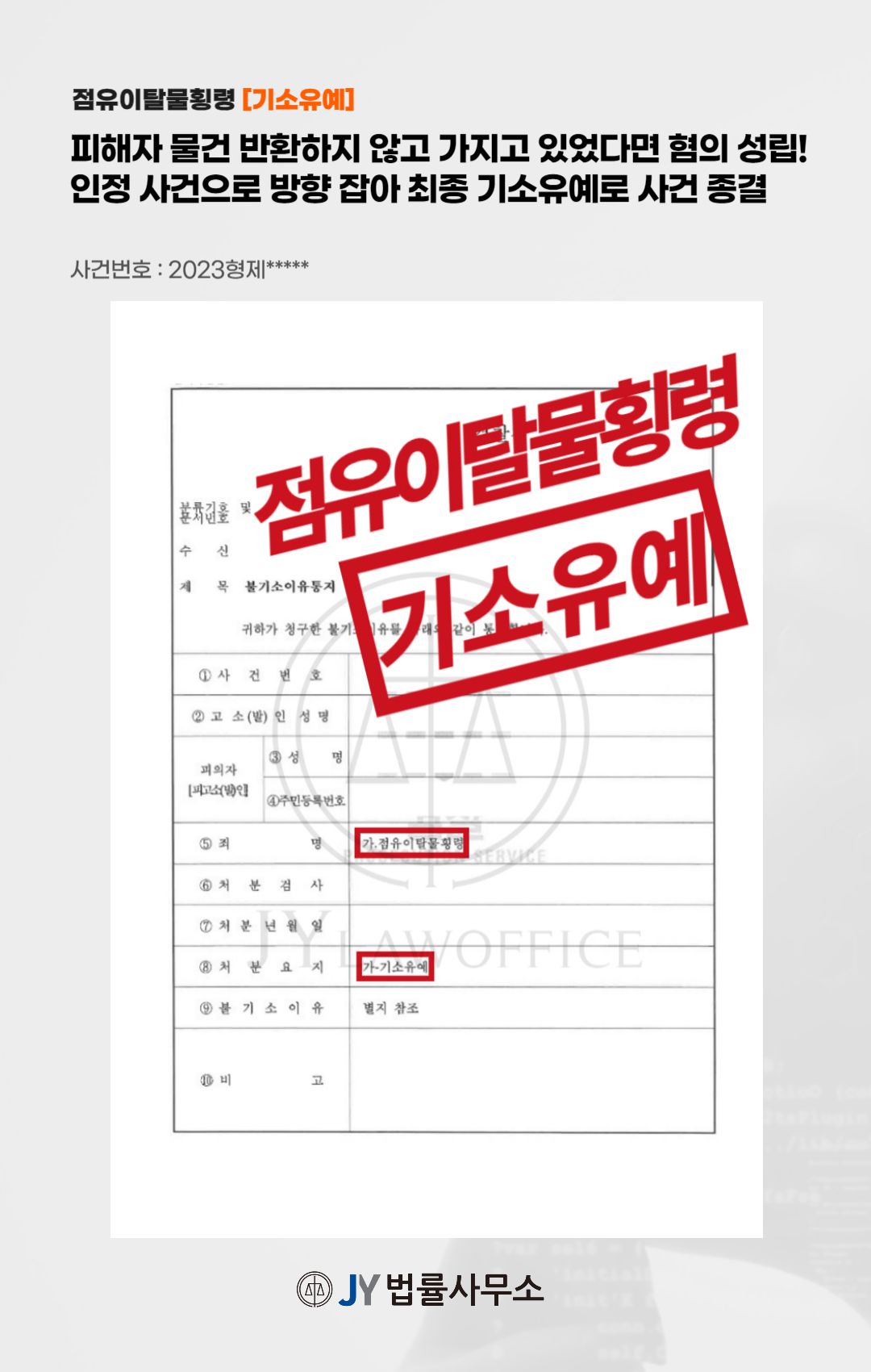 본 사건의 의뢰인은 피해자의 물건을 반환하거나 필요한 절차를 밟지 않은 채 가지고 가 피해자의 점유를 이탈한 재물을 횡령하였습니다. 이에 '점유이탈물횡령'혐의를 받게 된 의뢰인은 상황을 해결하고자 본 JY법률사무소를 찾아주셨습니다.