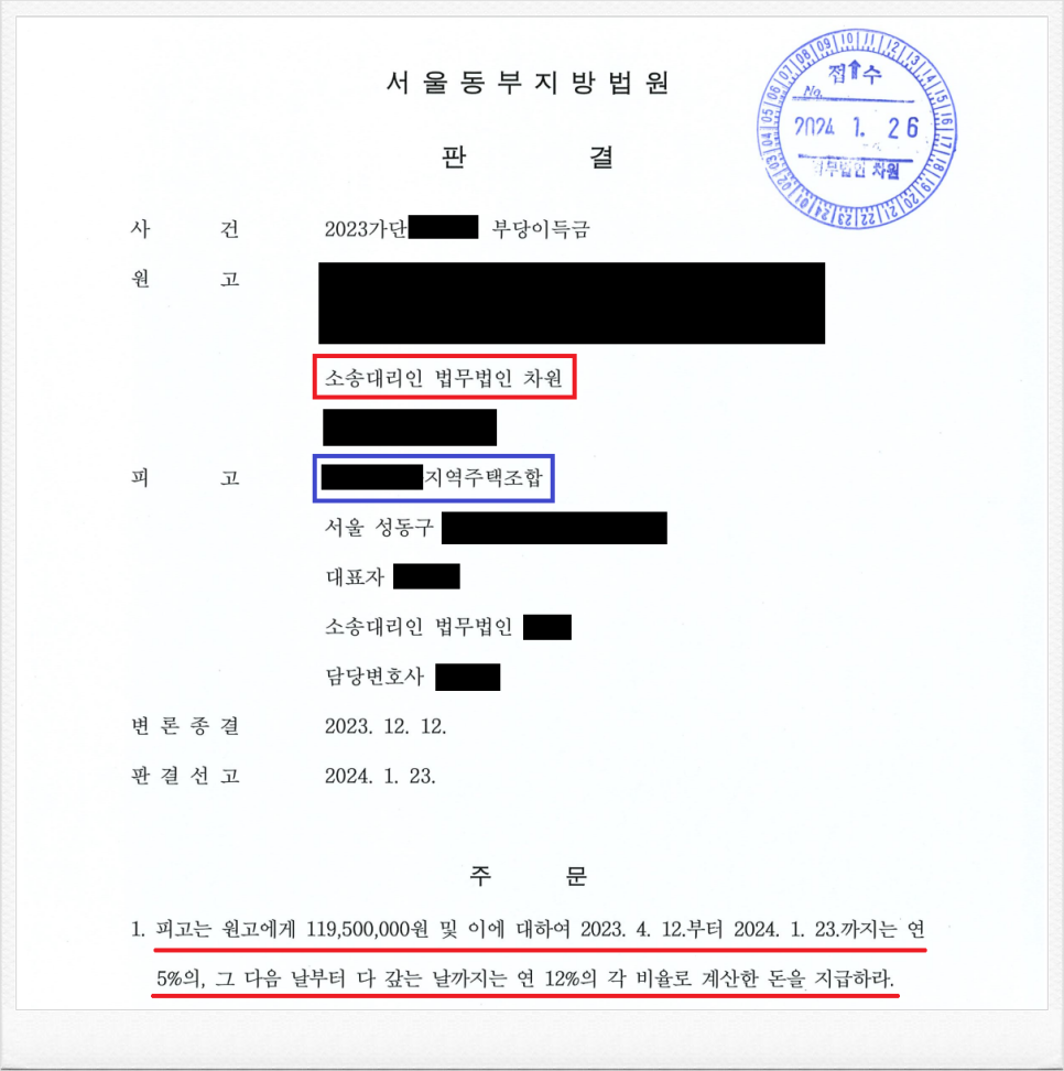 그러나, 가입 후 피고 지역주택조합 측이 진행하는 사업이 계획대로 진행되지 않았고, 이에 의뢰인은 정식 민사소송을 통하여 조합과 체결한 계약을 취소한 후 기 납입한 금원의 반환을 원하셨습니다.