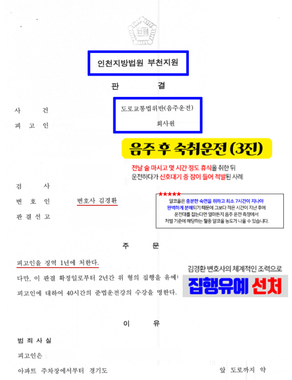 상담부터 재판 과정까지 김경환 대표변호사가 끝까지 직접 조력한 결과, 인천지방법원 부천지원 재판부는 음주3진에 수치가 높다는 점에서 엄중한 처벌이 내려져야 할 사안이지만 김경환 형사전문변호사가 제출한 의견서와 변론내용을 종합적으로 참작하여 집행유예 불구속 선고를 하겠다며 선처하였습니다.