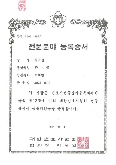 대한변호사협회 등록 조세법 전문 변호사 곽우섭 드림