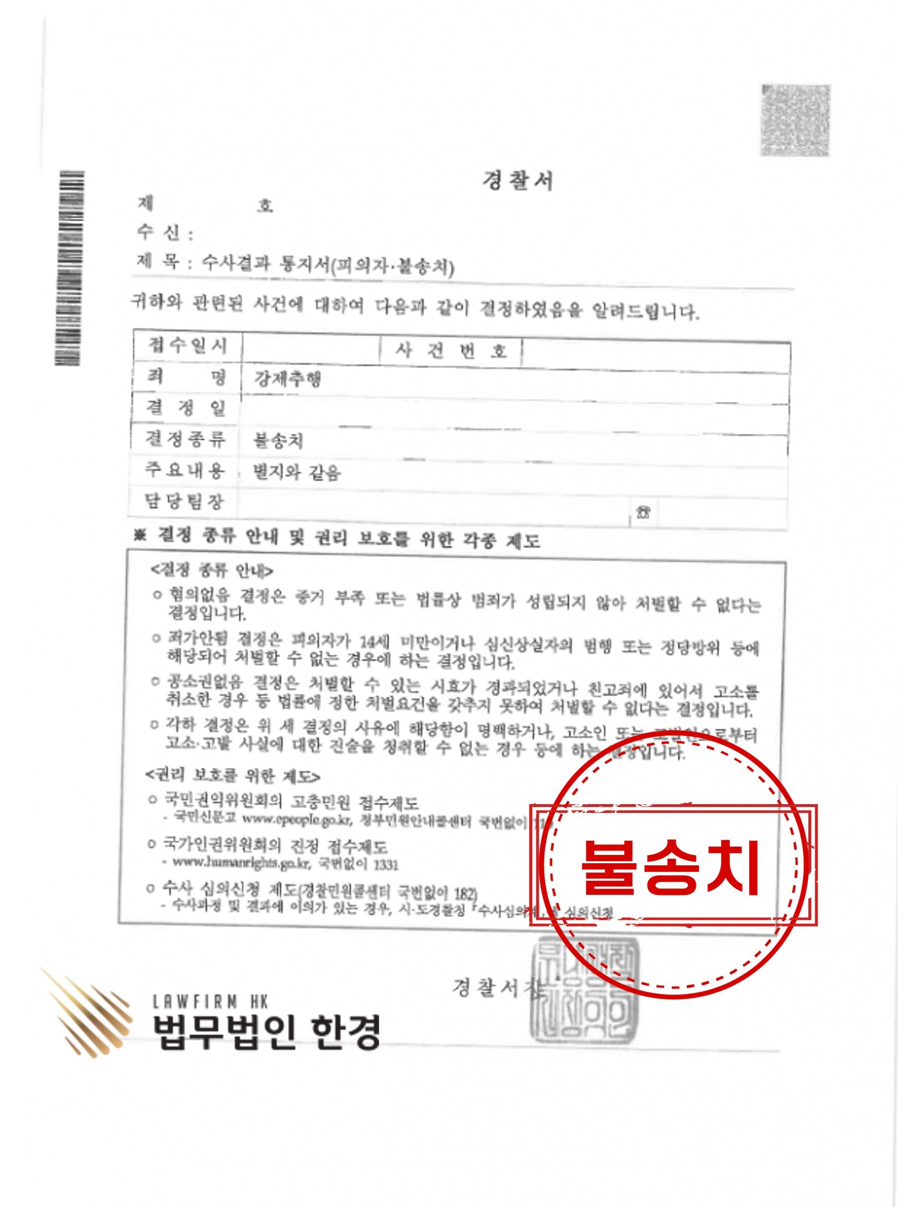 이상과 같은 노력을 한 결과 의뢰인 A씨는 경찰로부터 불송치(혐의없음)결정을 받을 수 있게 되었습니다.