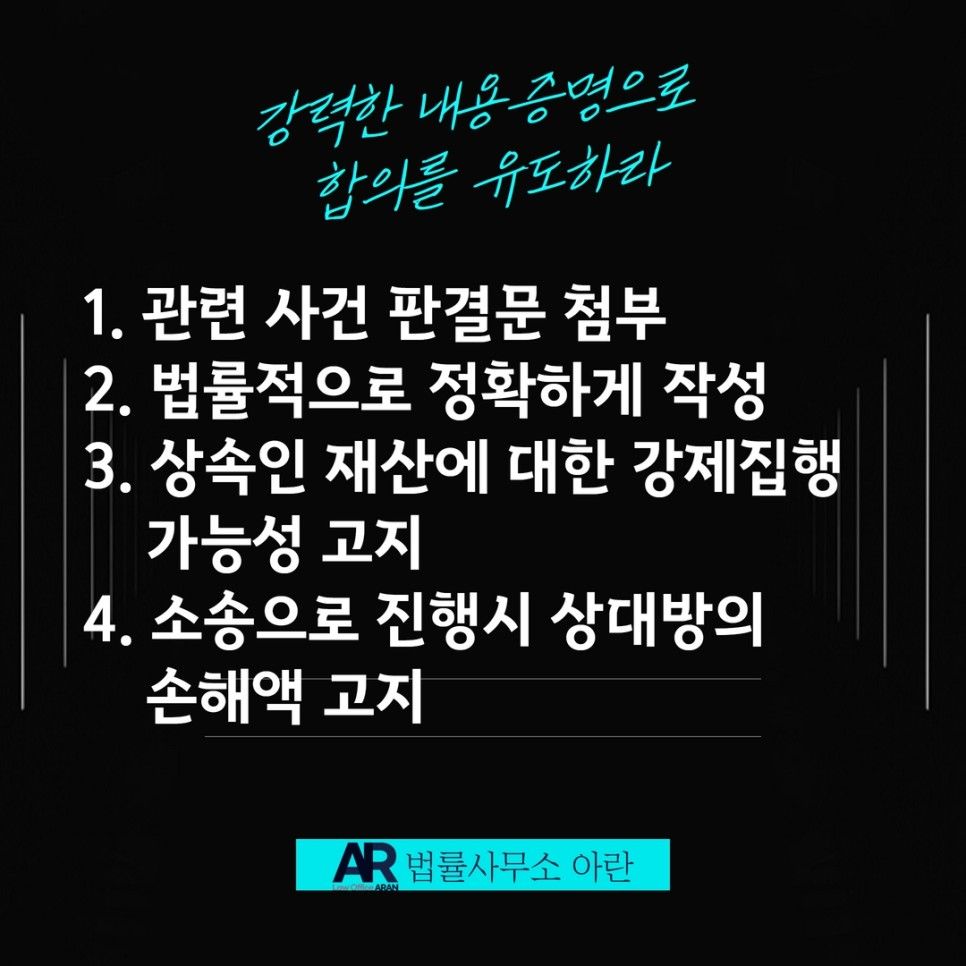 내용증명을 통해 합의가 성사되기 위해서는 소송으로 진행시 상대방이 패소할 것이라는 확신을 주어야 합니다. 그리고 그 확신은 주기 위한 팁은 다음과 같습니다.