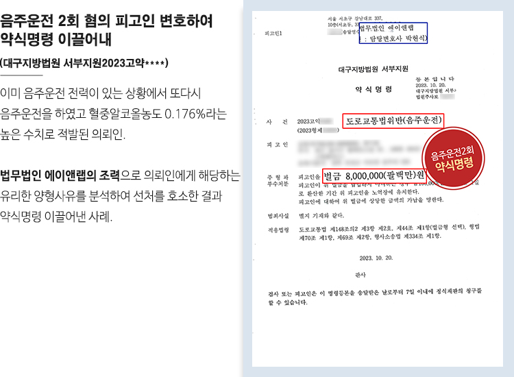그 결과 사건을 담당한 대구지방법원 서부지원은 이러한 변호사의 주장을 인정하였고 음주운전 2회에 혈중알코올농도도 높았음에도 약식명령을 내렸습니다.