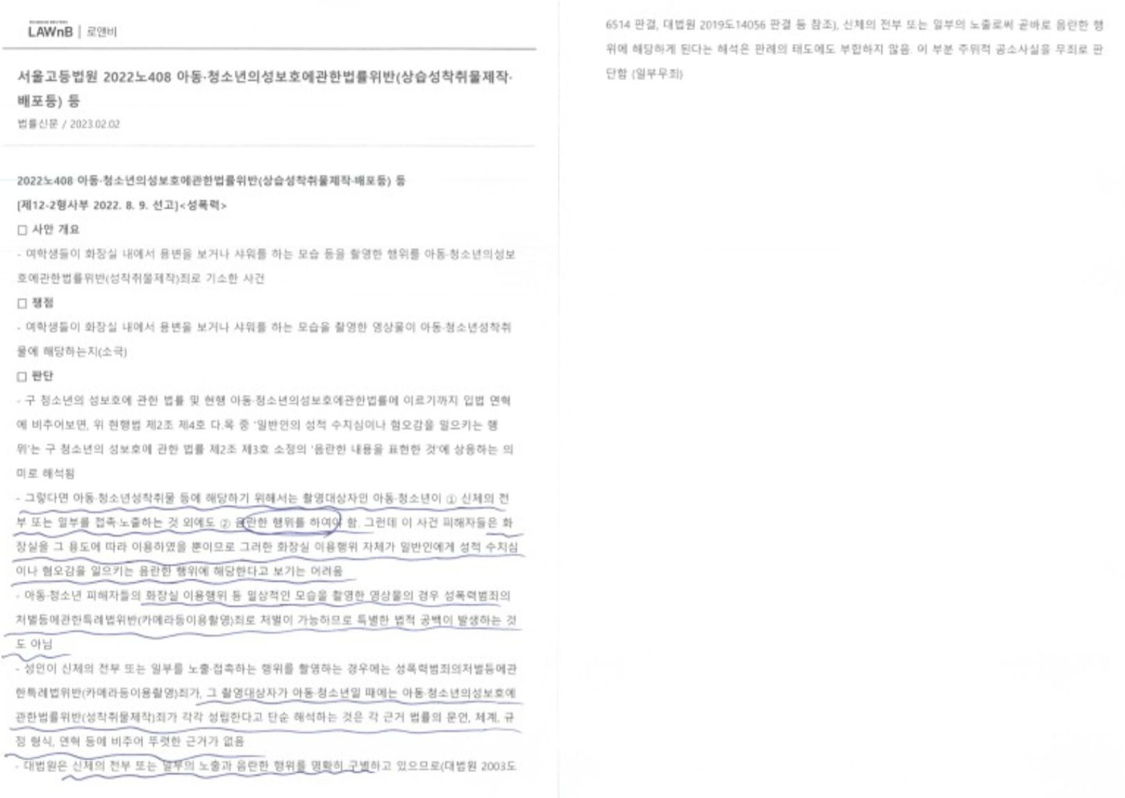 이러한 판례는 이후에도 유지되어 아래와 같이 아동성착취물제작죄에 대하여 무죄판결이 나오기도 하였습니다.