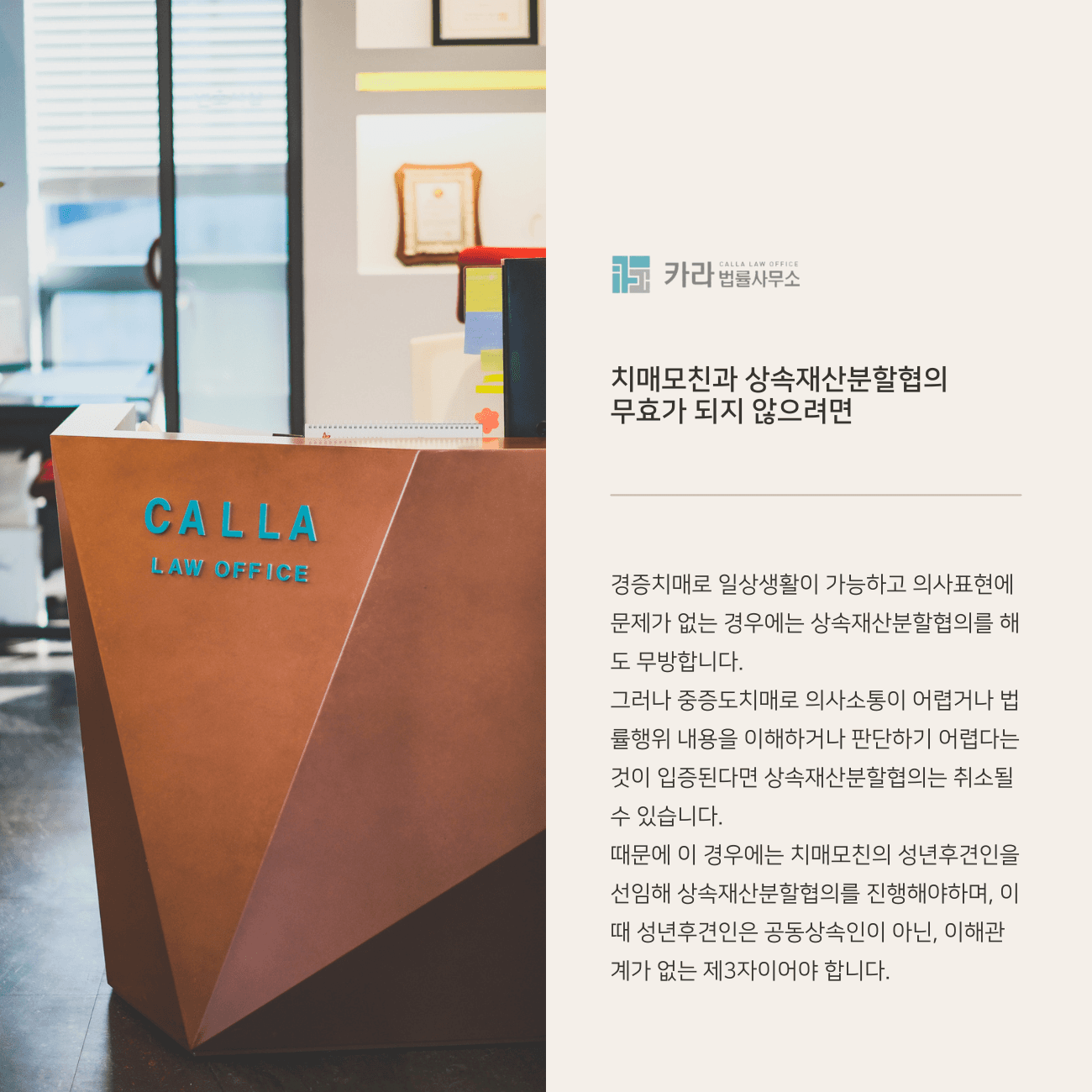 때문에 이 경우에는 치매모친의 성년후견인을 선임해 상속재산분할협의를 진행해야하며, 이때 성년후견인은 공동상속인이 아닌, 이해관계가 없는 제3자이어야 합니다.