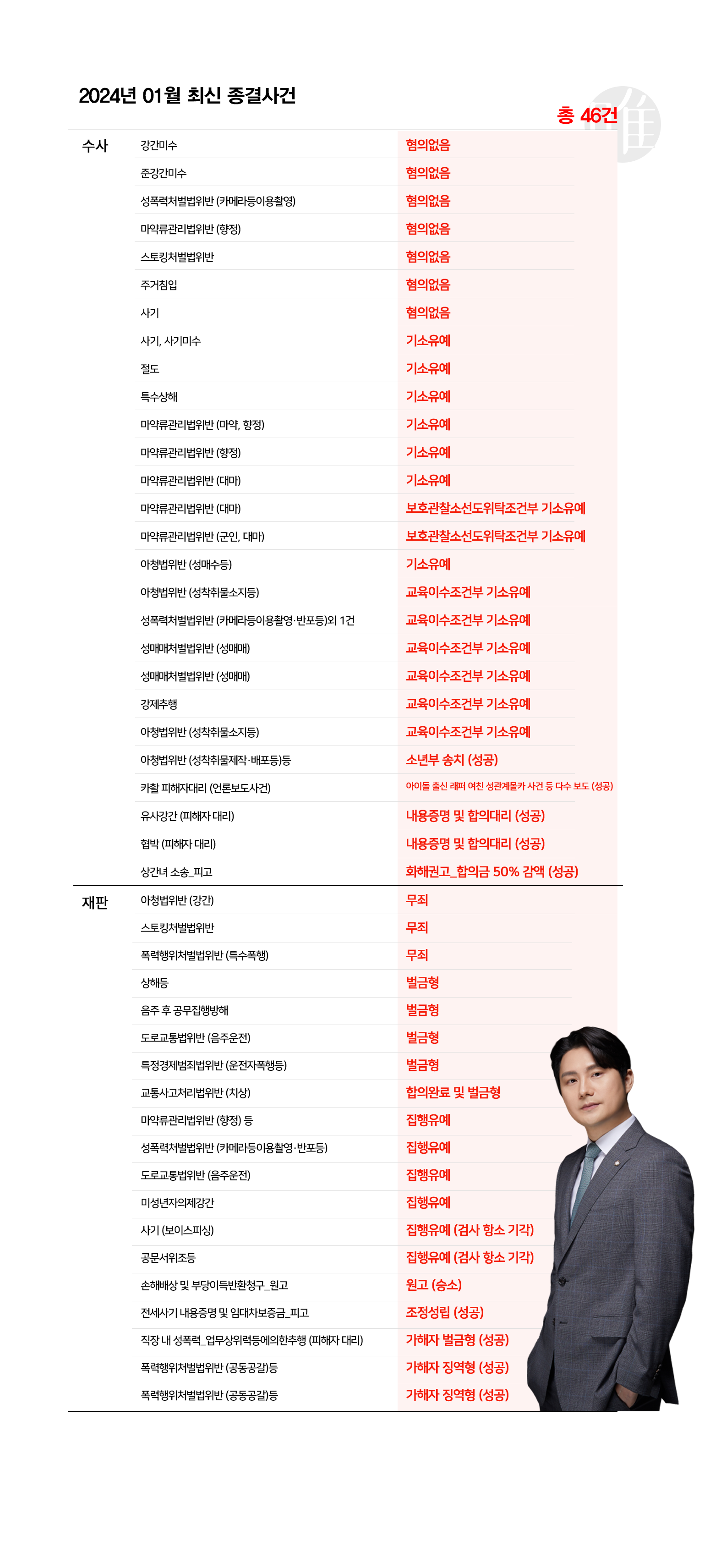 아무래도 연말연초에 모임 등이 많다 보니 여전히 술자리에서 이어지는 마약사건이나 특히 성범죄 사건이 다수를 이루고 있는데요. 1월에는 저희 로펌에서 총 46건의 사건이 성공적인 결과로 마무리되었습니다.