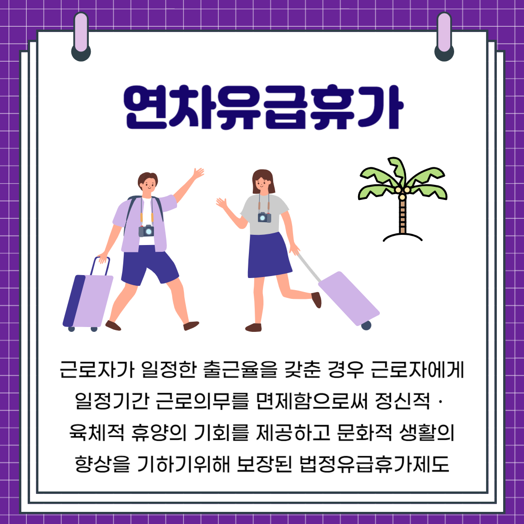 연차유급휴가란, 근로자가 일정한 출근율을 갖춘 경우 근로자에게 일정기간 근로의무를 면제함으로써 정신적ㆍ육체적 휴양의 기회를 제공하고 문화적 생활의 향상을 기하기 위해 보장된 법정유급휴가 제도입니다.