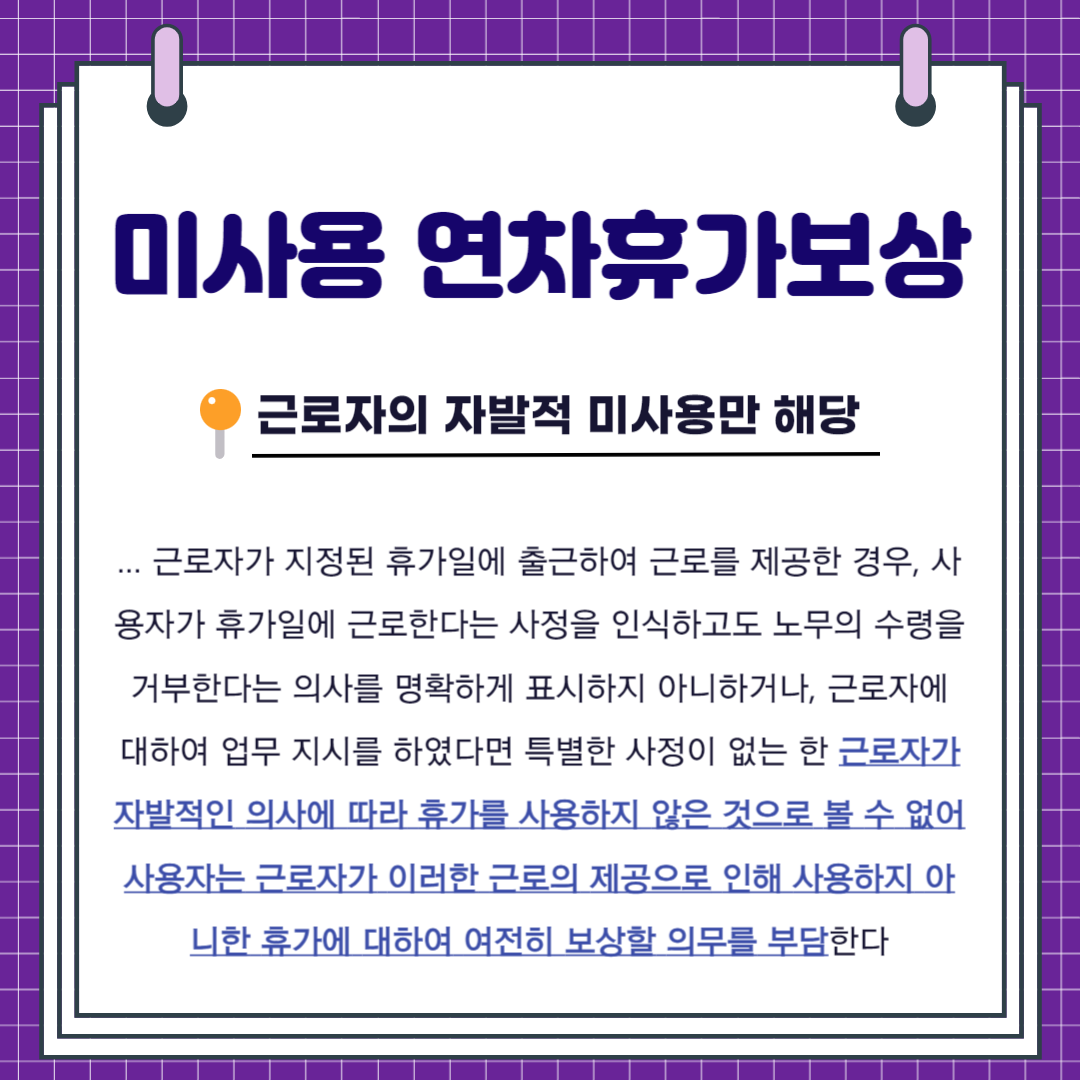 판례도 근로자가 지정된 휴가일에 출근하여 근로를 제공한 경우, 사용자가 휴가일에 근로한다는 사정을 인식하고도 노무의 수령을 거부한다는 의사를 명확하게 표시하지 아니하거나, 근로자에 대하여 업무 지시를 하였다면 특별한 사정이 없는 한 근로자가 자발적인 의사에 따라 휴가를 사용하지 않은 것으로 볼 수 없어 사용자는 근로자가 이러한 근로의 제공으로 인해 사용하지 아니한 휴가에 대하여 여전히 보상할 의무를 부담한다고 판시하였습니다.