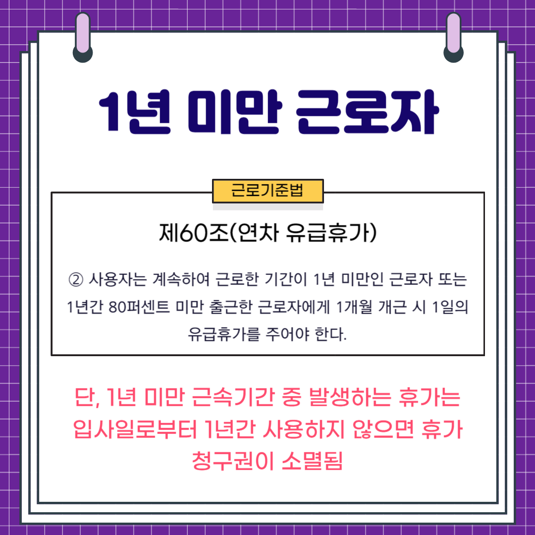 꼭 1년을 채워야만 연차가 발생하는거냐고 질문하시는 분들이 계신데요, 법에 따라 근로기간이 1년 미만인 근로자 또는 1년간 80%미만 출근한 근로자에게는 1개월 개근시 1일의 연차유급휴가가 부여됩니다.