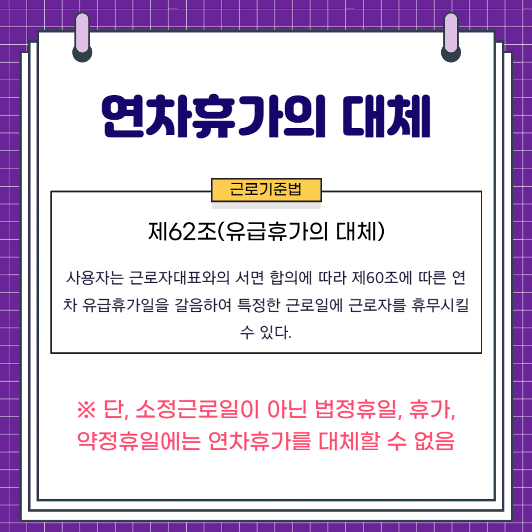 연차휴가의 대체란, 소정근로일을 특정하여 연차휴가를 사용하게 함으로써, 특정 근로일의 근로제공 의무를 면하는 것을 말하는데요, 아무 날이나 연차유급휴가일을 대체할 수 있는 것은 아니고 소정근로일이 아닌 법정휴일이나 휴가, 약정휴일에는 연차휴가를 대체할 수 없습니다.