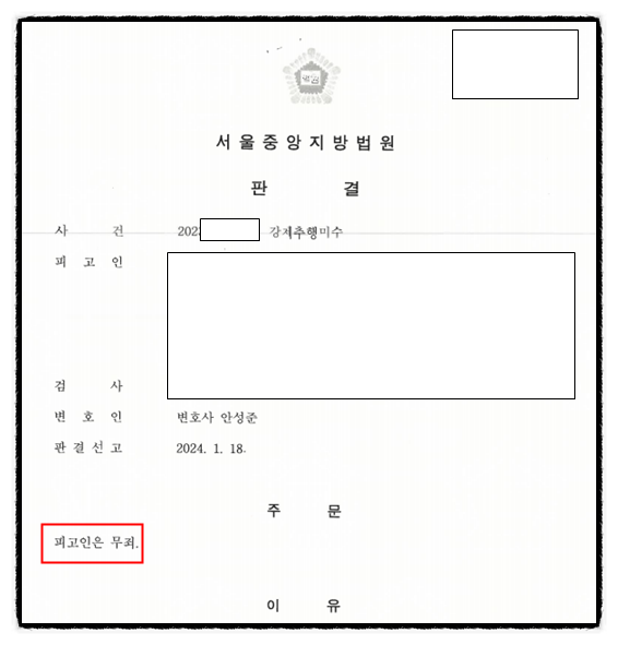 결과부터 말씀드리자면 의뢰인은 체계적인 변호를 통해 다행히 무죄를 받게 되었습니다.