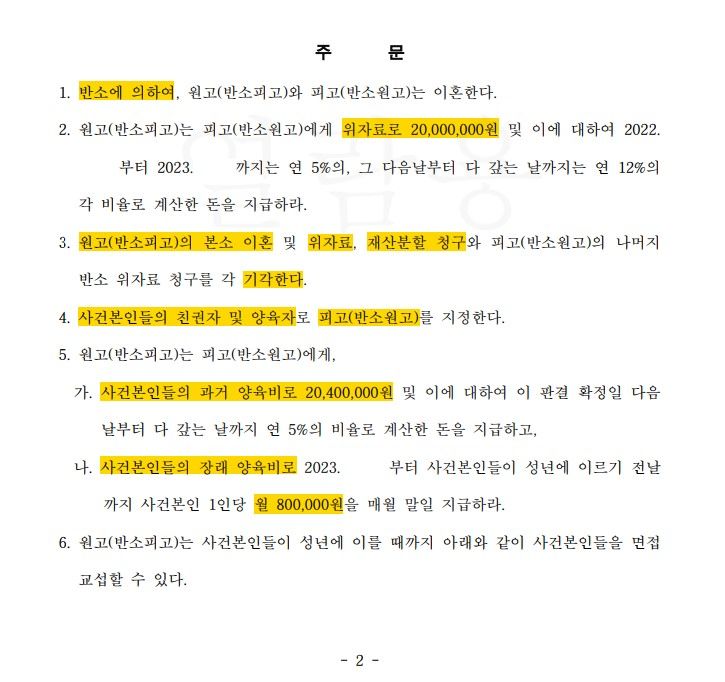 소송 결과, 재판부는 원고의 청구에 대해 '피고의 반소 이혼 청구만 인용, 원고의 위자료 및 재산분할 청구 전부 기각,