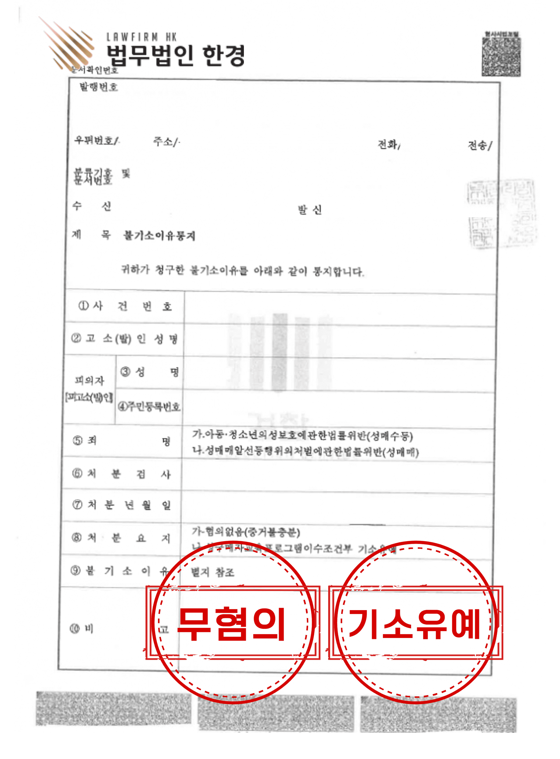 이상과 같은 노력을 한 결과 피의자 신분이었던 의뢰인 A씨는 아청법위반(성매수등) 사건에 대해서는 무혐의 처분을 성매매 사건에 대해서는 기소유예 처분을 받을 수 있게 되었습니다.