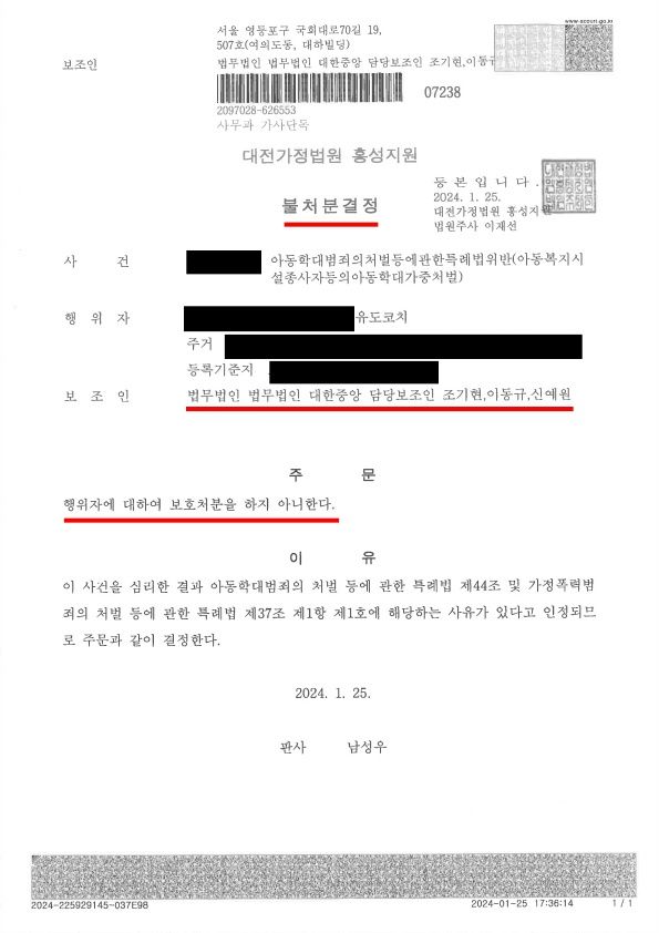 선생님의 처벌을 원하는 아이가 있고, 형사기소된 사건이었음에도 불구하고, 불처분결정을 받는데 성공했습니다.