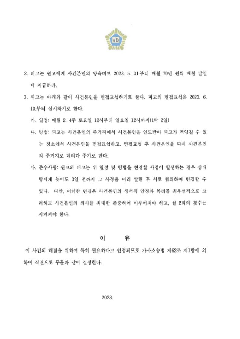 ① 상대방이 청구한 위자료 및 재산분할 금액을 모두 방어하여 돈을 지급하지 않았고, ② 오히려 위자료와 재산분할금으로 5,000만 원을 지급받았으며, ③ 의뢰인은 아버지임에도 불구하고 이례적으로 자녀에 대한 친권 및 양육권을 가지며, 자녀가 성년에 이를 때까지 양육비를 지급받는 것으로 조정이 성립되었습니다.
