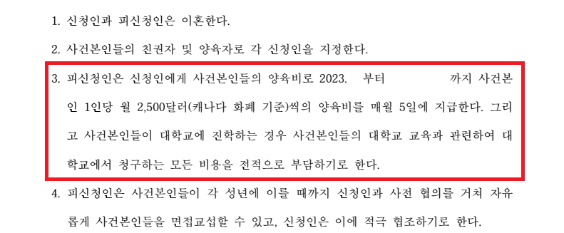 이에 따라 자녀들의 대학등록금을 비롯하여 대학교 교육과 관련한 비용을 지급한다는 조항까지 포함되었습니다.