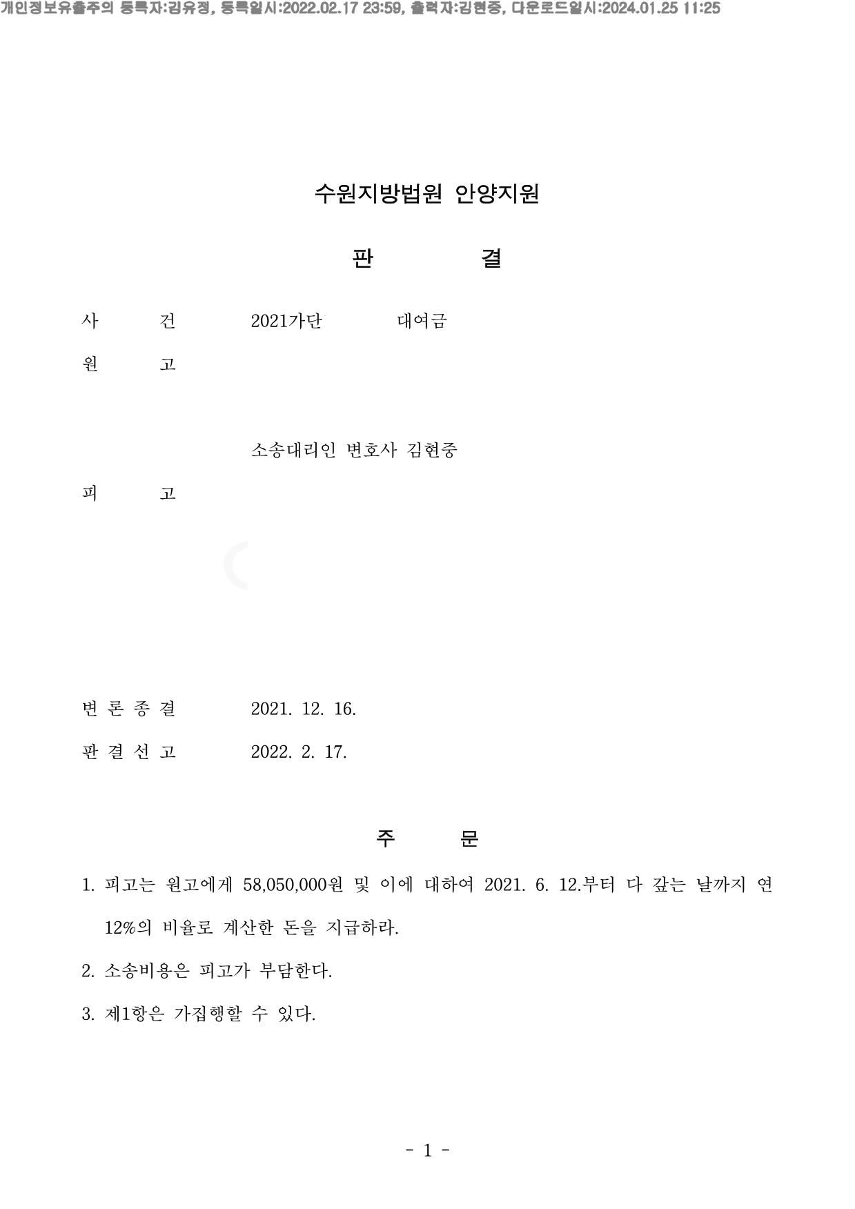 이에 원고의 변호사로써 원고와 피고의 일련의 카카오톡 대화내용과 원고와 피고 사이에 이루어진 일련의 입금과 출금 내역 등 증거를 분석하여 피고에 대하여 대여금반환청구소송을 제기하였고,