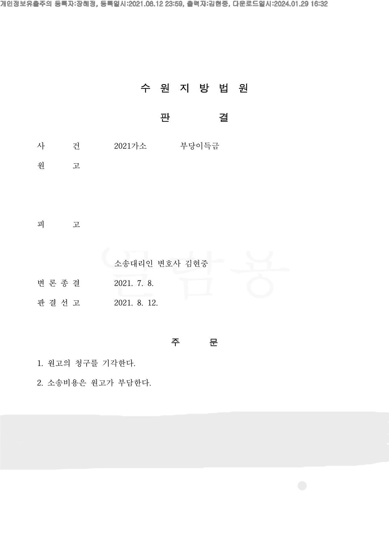 ****판결문을 보시면 아시겠지만 변호인으로서 제 이름만 들어가 있는 것을 확인하실 수 있습니다. 제가 온전히 혼자서 이끌어 낸 사례만을 저의 해결사례로 올리는 것이니 참고 바라며, 고용 변호사가 처리한 사건에서 제 이름만 들어간 사례라던 가 다른 변호사들과 함께 처리한 사건에서 제 이름이 들어갔다는 이유로 자신의 독자적인 해결사례인 것처럼 올리지 않습니다. 또한 착오가 없는 이상, 기존에 올렸던 해결사례를 일정 기간이 지난 후에 새로운 해결사례인 것처럼 재차 업로드 하지 않습니다. ****