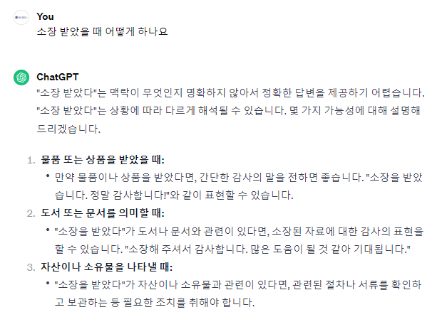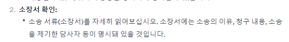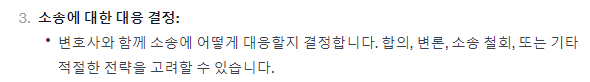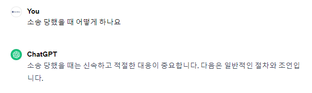 챗 GPT는 전세계 공통 솔루션이다. 소장을 받았을 때 나라마다 기한이 다를 수 있다. 하지만 대부분 기한은 있다. 우리나라는 소장을 받은지 30일 안에 답변서를 내야한다. 안 내면 무변론 선고기일을 지정되고 패소가능성이 높다. 기간을 준수하라는 안내를 하는데 이것도 정확하다.