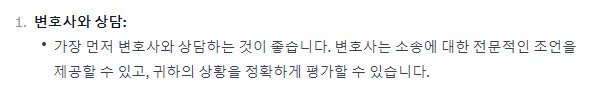 아직은 변호사의 역할이 충분하고 AI 로부터 인정받는다고 느꼈다. 하지만 놀라울 정도로 프로세스를 정확히 인지하고 적절한 가이드라인을 주고 있다. 소송 당했을 때 어떻게 하나요? 는 단순히 소송 절차만 물어보는 게 아니라 전체적인 방향을 물어보는 질문이다. 그럼에도 솔루션이 나왔다는 것이 놀랍다.