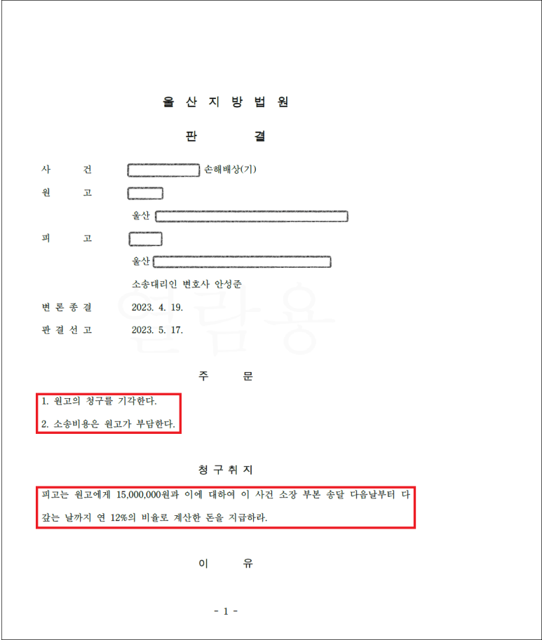 이런 결과로 [ 원고의 청구기각 ] 이 이뤄지게 되었습니다. 재판부가 의뢰인의 행위는 ‘ 불법 행위에 해당하지 않는다 ’는 원고의 청구를 기각한 것입니다.