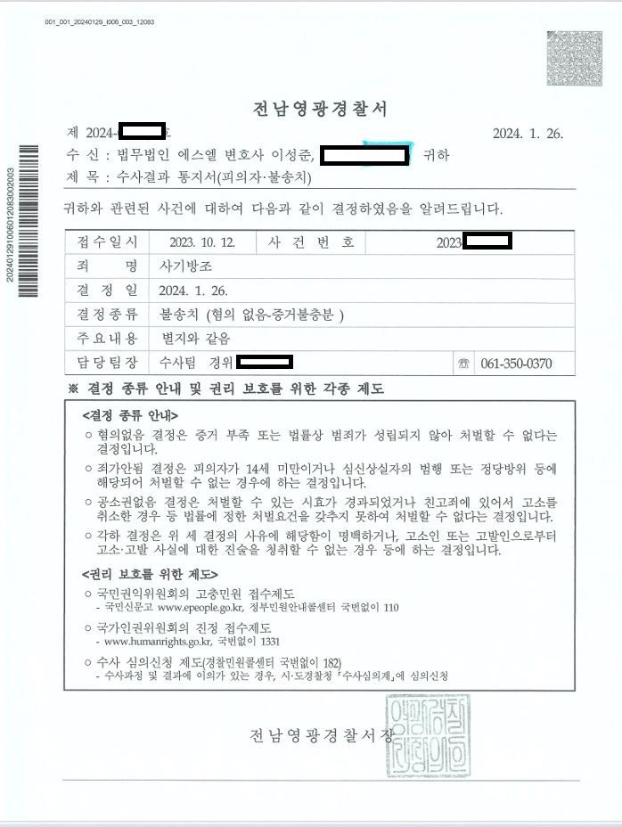 의뢰인은 sns를 통해 알게 된 성명불상자와 상당기간 대화를 나누며 친분을 쌓았습니다. 어느정도 친분이 쌓이자 성명불상자는 의뢰인에게 주식투자금을 배분하는 일이라며 의뢰인의 계좌를 통해 돈을 받고 성명불상자가 지시하는 대로 돈을 송금해주면 소정의 수수료를 주기로 약속하였고 이에 의뢰인은 성명불상자의 제안을 수락하여 자신의 계좌를 통해 돈이 이동할 수 있도록 제공하였습니다. 그러나 의뢰인에게 입금된 돈은 보이스피싱 피해금이었고 얼마지나지 않아 보이스피싱 사기 피해자의 신고로 의뢰인의 계좌는 정지되고 의뢰인은 형사입건되었습니다. 당시 의뢰인이 받은 수수료는 상당한 금액이었는데 단순히 계좌이체 작업을 해준 것만으로 그러한 고액의 수수료를 받은 것이 일반적인 상식에 부합하지는 않아 사기 방조죄가 성립될 가능성이 상당했습니다. 그러나 저희의 도움을 받아 여러가지 사기인식 가능성을 부정할 만한 주장을 할 수 있었고 다행히 불송치 결정을 받을 수 있었습니다.
