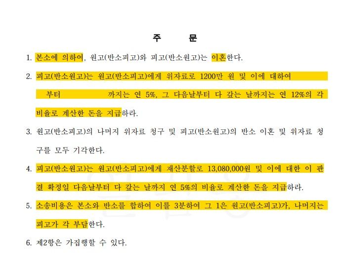 재판부는 의뢰인의 제출 증거로 미루어 보아, 아내의 행위가 '부부의 정조의무에 충실하지 않은 부정한 행위'에 해당한다고 하며, 위자료 1,200만 원을 인용하였습니다. 재산분할에 있어, 재판부는 김은영 변호사가 주장한 대법원 판례를 그대로 인용하여 채무 초과상태에서도 재산분할이 가능함을 설시하고, 아내가 의뢰인에게 대출금의 일부를 재산분할로 지급해야 한다고 인정하였습니다. 의뢰인은 아내로부터 위자료를 지급받고 아내와 채무를 분담할 수 있게 된 것에 크게 만족하였습니다.