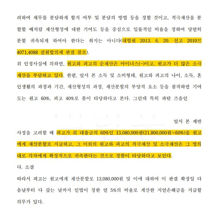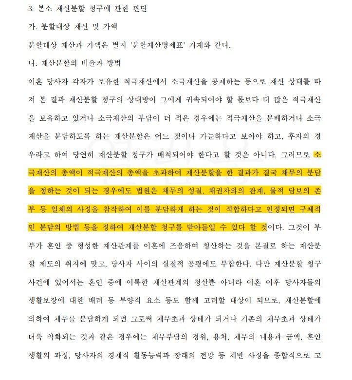 가장 중요한 재산분할에 있어, 김은영 변호사는 '부부의 합계 재산이 채무 초과 상태'임에도 재산분할이 가능하다는 대법원 판례를 인용하여 재판부에 재산분할에 대한 판단이 필요하다는 의견을 개진하였고, 의뢰인 부부의 채무 대부분은 아내가 과소비하고 탕진하며 실행한 것이므로 이에 대한 아내의 책임이 더 큰 것을 고려하여 재산분할 액수가 정해져야 한다고 주장하였습니다.
