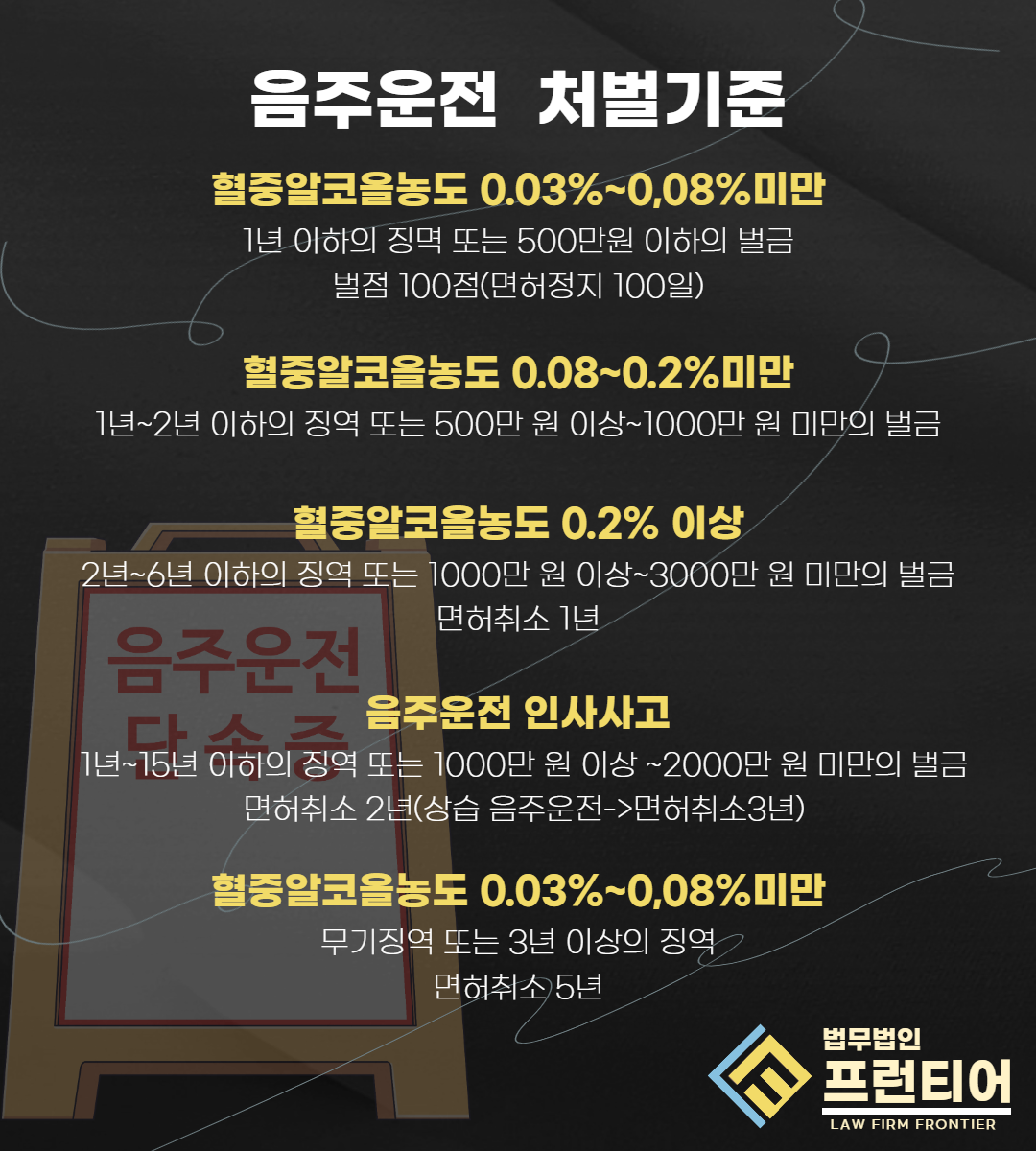 ※ 만약 본인이 음주운전 중 사고가 있으셨거나 0.2% 이상의 혈중 알코올농도로 적발되셨다면 시급히 변호사와의 상담을 받아보시는 것을 권장 드립니다.