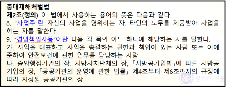 이 때 처벌 대상이 ‘사업주’ 및 ‘경영책임자등’의 범위에 대해서는 법 제2조 제8호 및 제9호가 규정하고 있습니다.