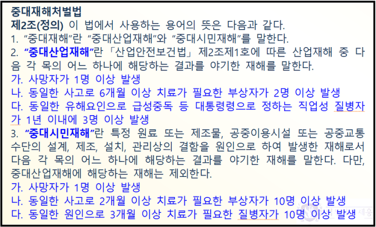 법률에서 규정하고 있는 중대재해란 중대산업재해와 중대시민재해를 말하는데요, 각각의 정의는 다음과 같습니다.