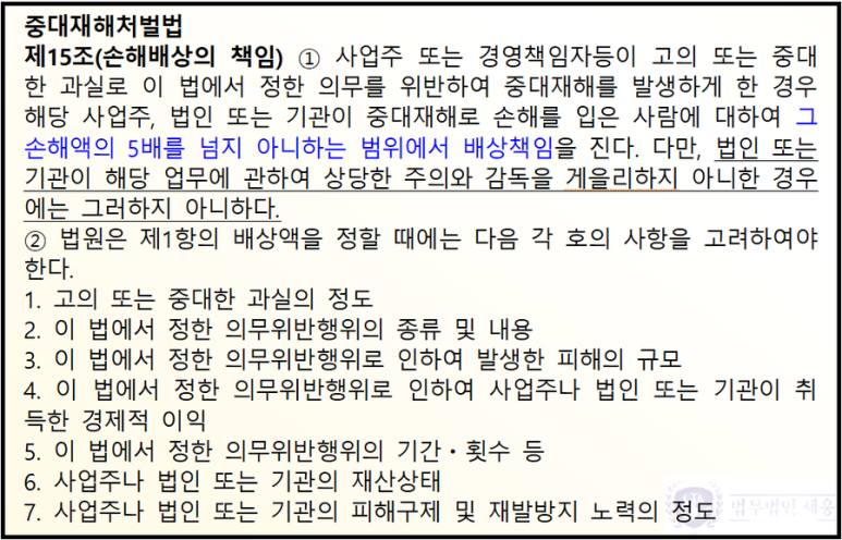 뿐만 아니라 중대재해처벌법은 손해배상에 대해서도 특별규정을 두고 있는데요, 일반적인 손해배상의 경우 피해자에게 발생한 실제의 손해액에 대한 배상이지만 중대재해의 경우 사업주나 경영책임자등의 고의 또는 중대한 과실로 인한 손해에 대해서 최대 5배까지의 징벌적 배상이 가능하도록 규정하고 있습니다.