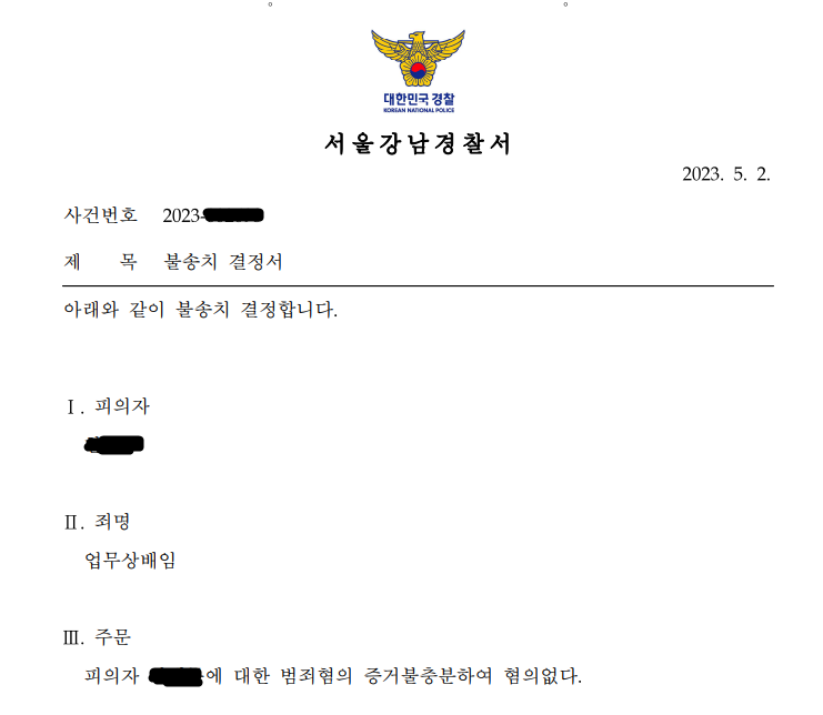 그 결과 강남경찰서는 변호인의 주장을 받아들여 본건 피의자에게 업무상 배임 및 업무방해의 혐의가 인정되지 않는다며 피의자에 대해 불송치(혐의없음) 결정을 하였습니다.