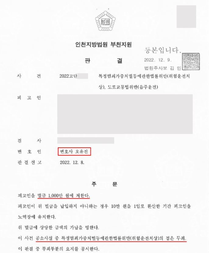 법원은 저희의 주장을 받아들여 이 사건 기록에 의하면 피고인이 혈중 알코올농도 0.229%의 술에 취한 상태에 있었던 사실만 이를 인정할 수 있을 뿐만 아니라 더 나아가 그러한 음주의 영향으로 정상적인 운전이 곤란한 상태에 있었다는 사실을 합리적 의심의 여지가 없을 정도로 뒷받침할 만한 증거는 찾아볼 수 없고 오히려 피고인의 진술로 보면 사건 이후의 정황이 피고인이 음주의 영향으로 정상적인 운전이 곤란한 상태에 있었는지에 대한 의문을 품게 만든다며 이 부분 공소사실은 범죄의 증명이 없는 때에 해당하므로 위험운전치상부분에 대하여는 무죄를 선고하고 음주운전 부분에 대하여만 벌금 1,000만 원을 선고한다고 밝혔습니다. 피고인은 위험운전치상죄 부분에 대하여 무죄를 선고받아 좋은 결과로 마무리할 수 있었습니다.