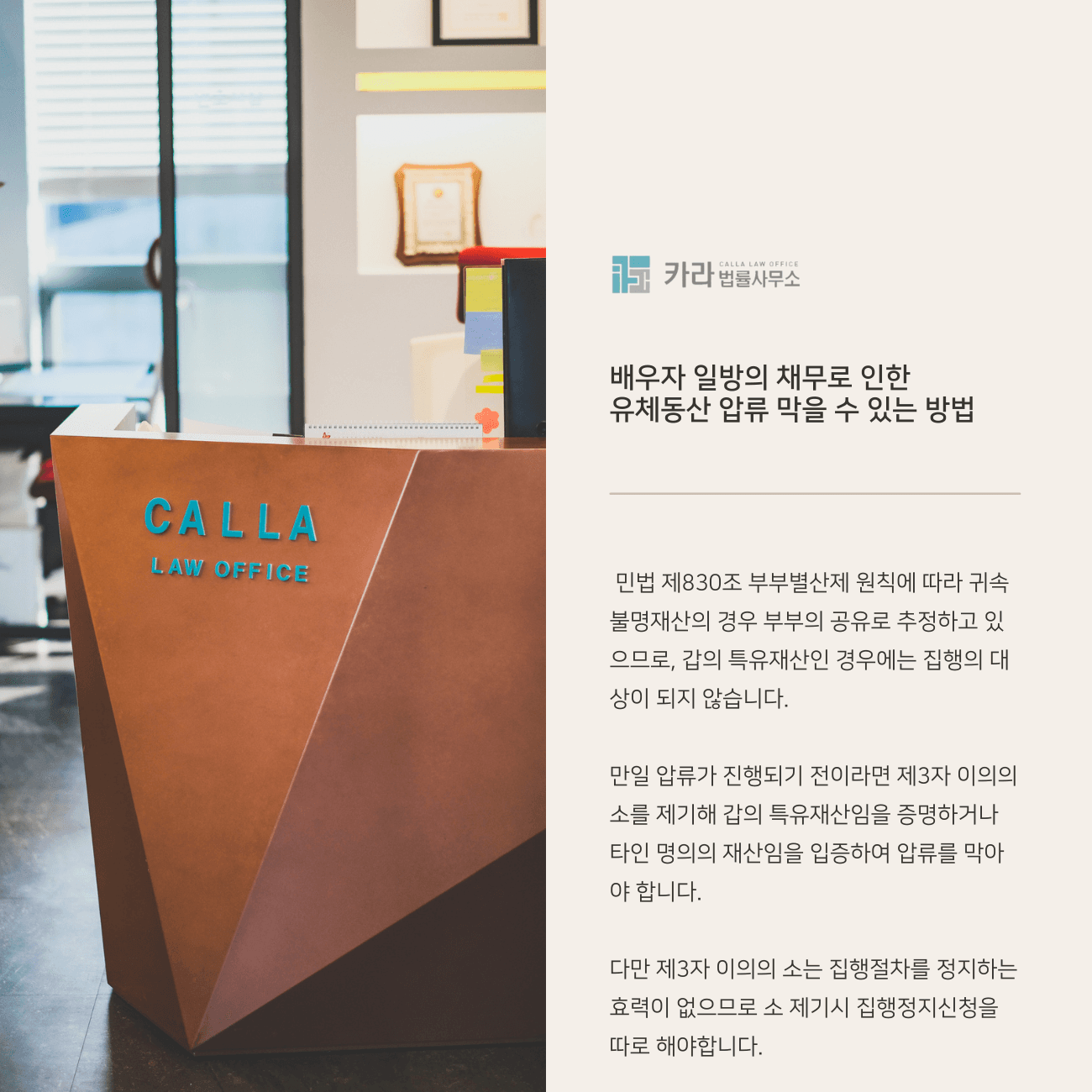 이번 시간에는 배우자 일방의 채무문제로 유체동산 압류 및 경매가 진행될 경우 대응방법에 대해 알아보도록 하겠습니다.