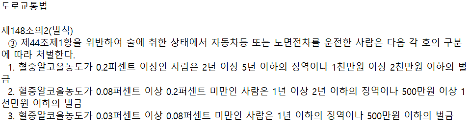 위에서 볼 수 있듯이, 알코올농도 수치 세 구간으로 나누어 처벌을 하는데요. 도로교통법 제148조의2 제3항 제3호는, 소주 두 잔 이상만 마시더라도 측정이 가능한 수치인만큼 운전에 유의하실 필요가 있겠습니다.