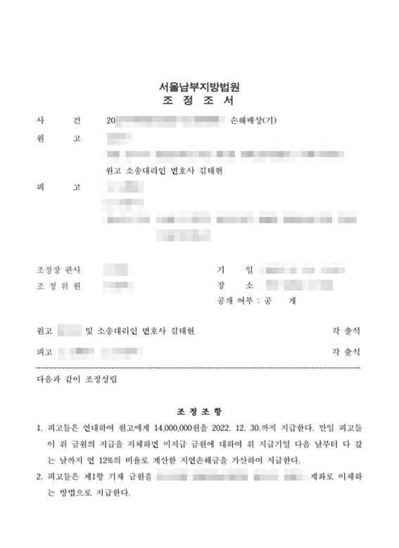 당사자들의 서면을 확인한 재판부는 조정에 회부를 하였고, 조정위원 역시도 임대인 측의 계약갱신거절에 있어 정당한 사유로 인정되기 어려워보인다는 판단 하에 임대인에게 배상이 이루어져야 함을 지속 언급한 바, 결국 손해배상으로 1,400만원을 지급하는 내용으로 조정에 이르게 되었습니다.