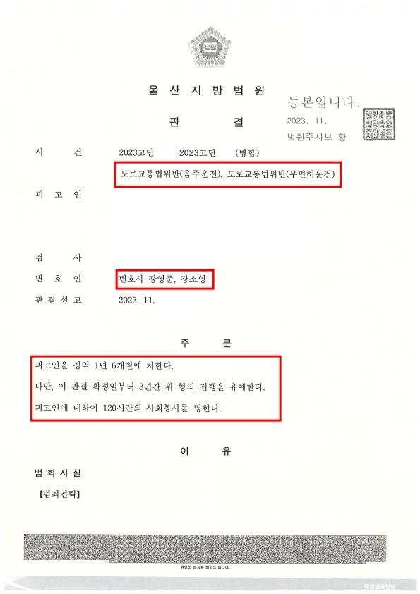 3. 그 결과 여러 번의 음주운전과 그로 인해 교통사고를 냈음에도 울산지방법원에서는 의뢰인에게 집행유예 판결을 선고하였습니다.