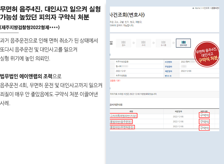 하지만 의뢰인은 이미 음주전과 3회가 있었으며 과거 음주운전으로 인해 운전면허가 취소된 상태에서 음주운전을 하게 된 것이라 실형 위기에 놓이게 되었습니다. 이에 의뢰인은 실형을 면하고자 황급히 저희 법무법인 에이앤랩을 찾아오셨습니다.